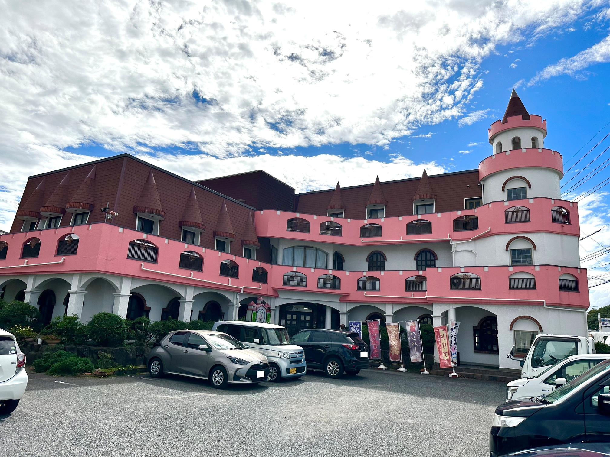 外観は特徴的な、ピンク色のお城です('ω')